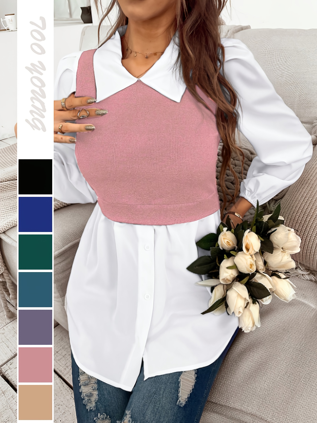 Plus Size – Plus Size Women’S Long Sleeve Top with Contrasting Colors, Elegant And Comfortable, Resembling a Two-Piece Casual Shirt