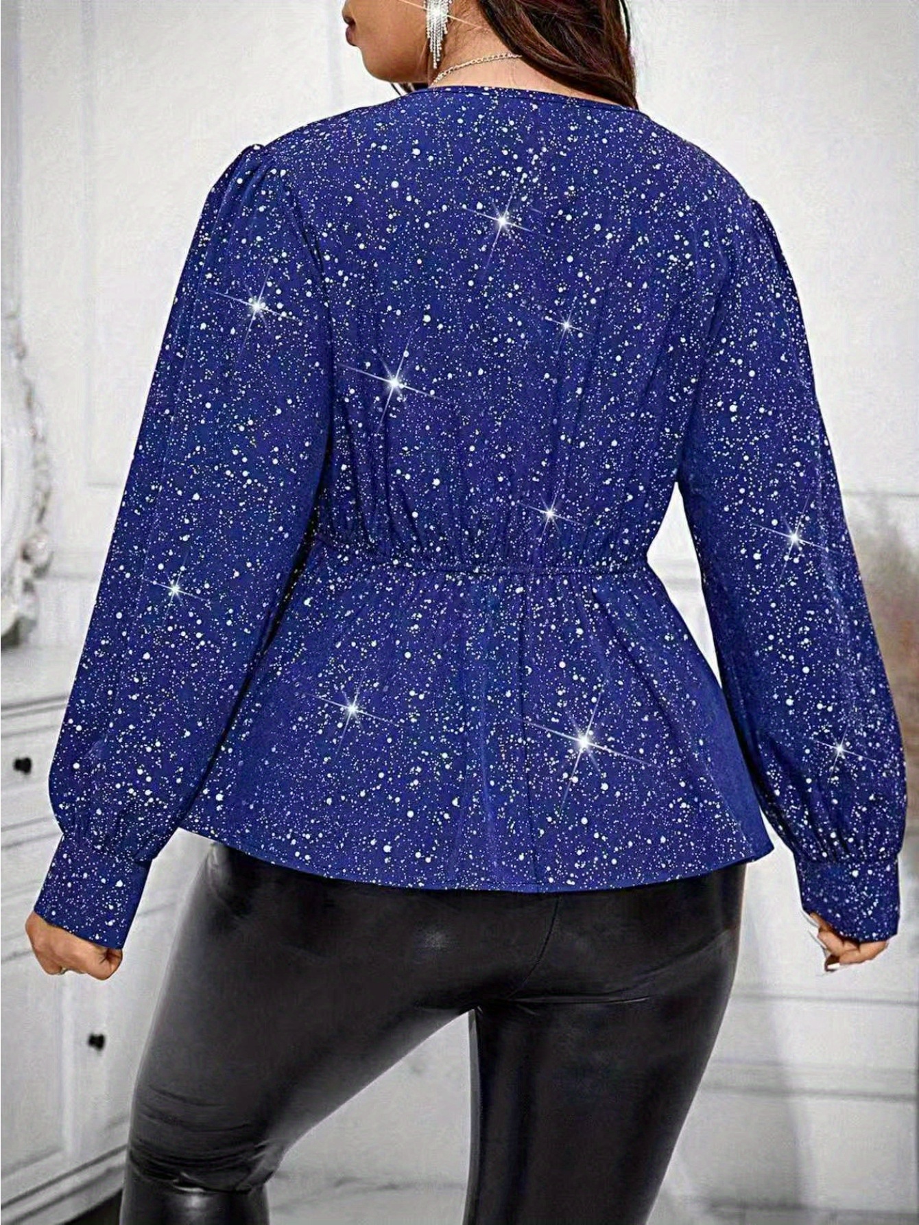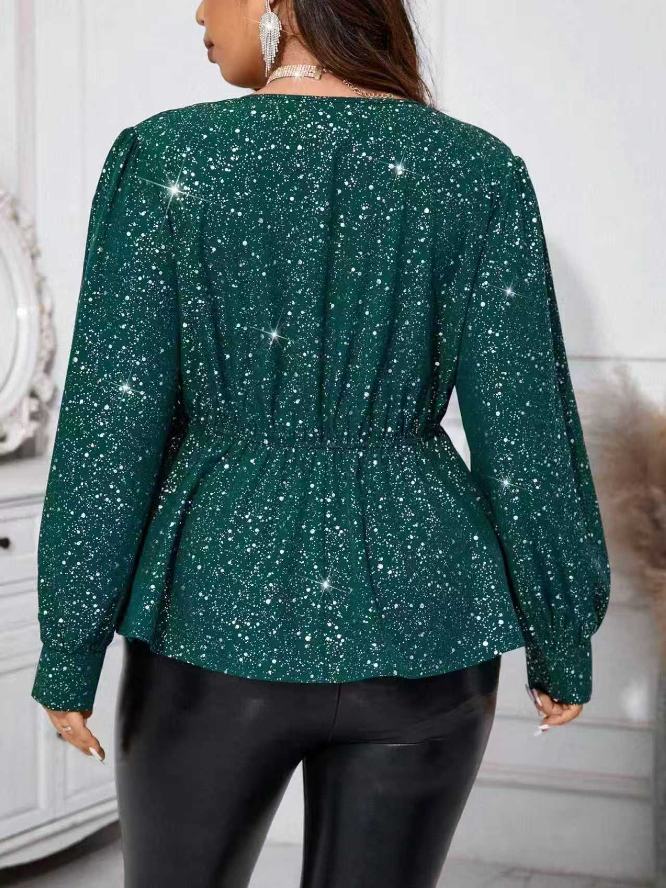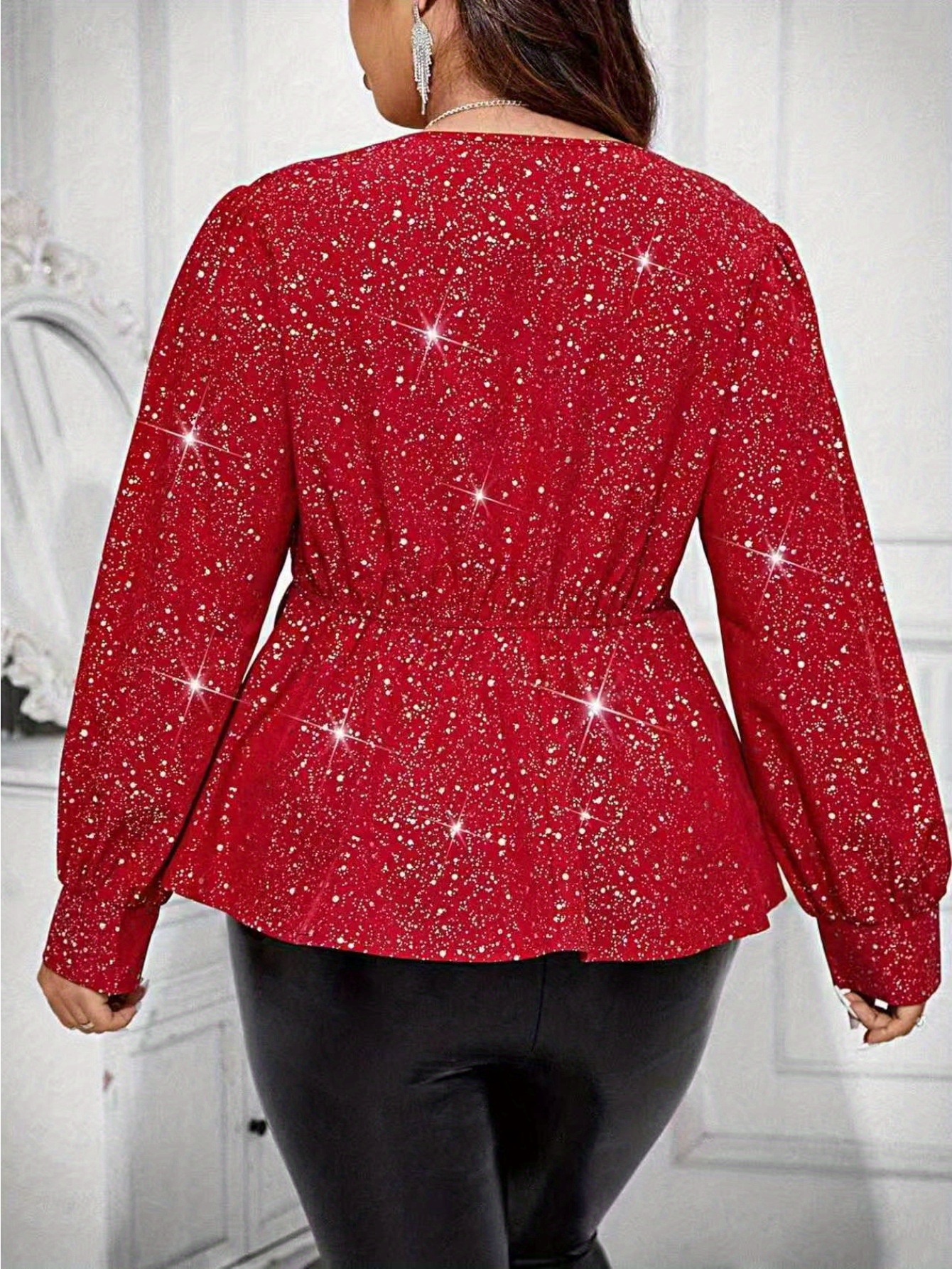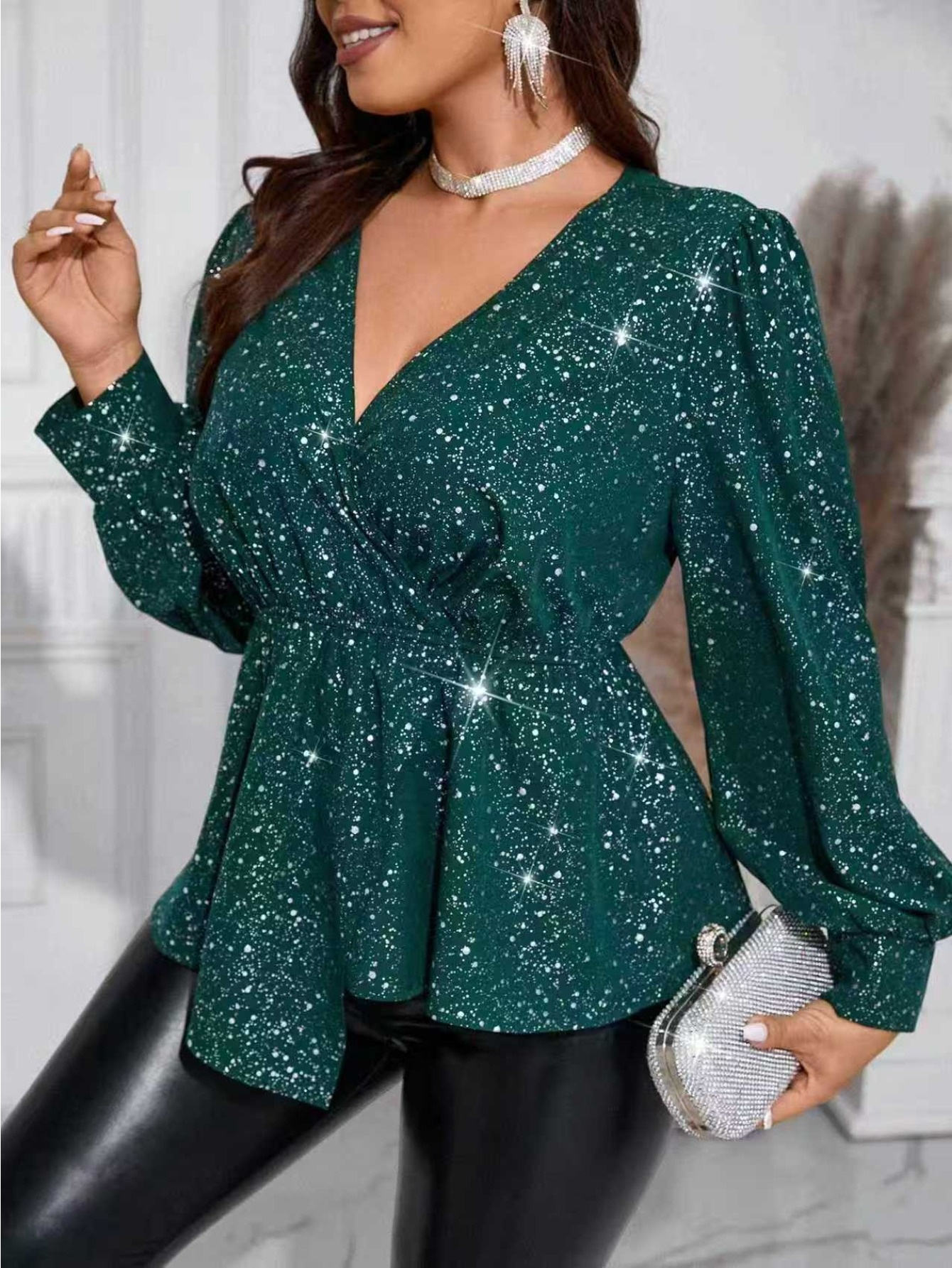 Plus Size – Oversized V-Neck Long Sleeve Blouse for Women, Featuring an Asymmetrical Ruffle Hem, Perfect for Trendy Clubwear And Casual Office Attire – Offers Available
