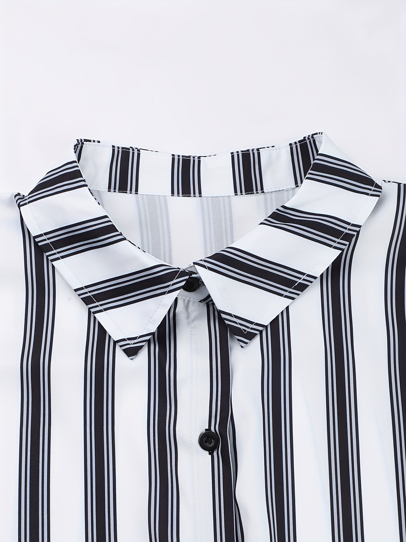 Plus Size, Women’s Plus Size Elegant Striped Blouse – Oversized Short Sleeve Button-Up Shirt with Collar & Chest Pocket, White/Black/Beige/Navy Blue Horizontal Stripes, Wrinkle-Resistant Casual to Professional Wear (Spring Summer Fall)