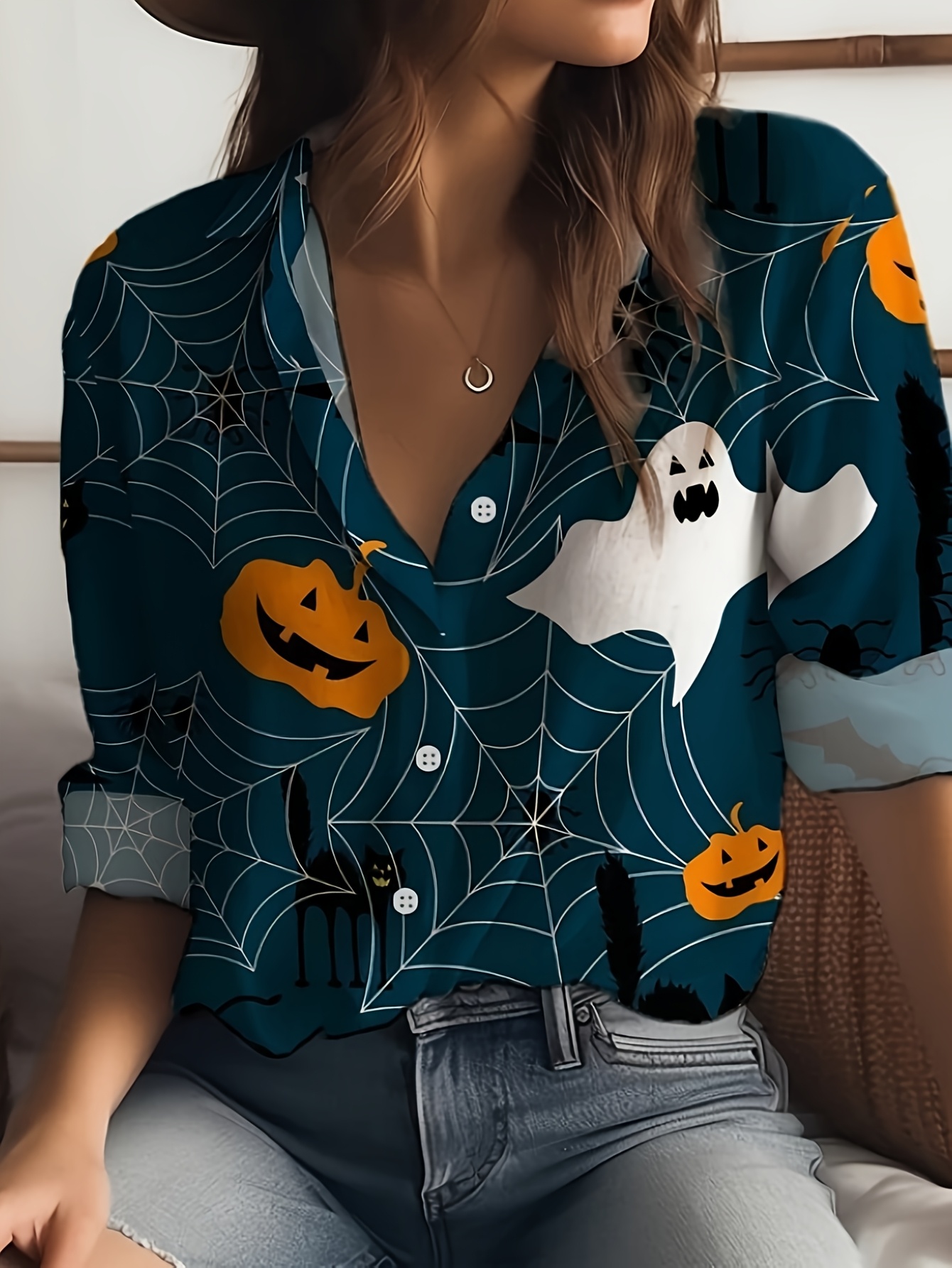 Plus Size, Women’s Plus Size Gothic 3D Printed Halloween Shirt – Oversized H-Line Button-Up Blouse with Spooky Bat,, Pumpkin & Cobweb Patterns, Dark Green/Black Casual Party Costume for Themed Events (Long Sleeve Collar)