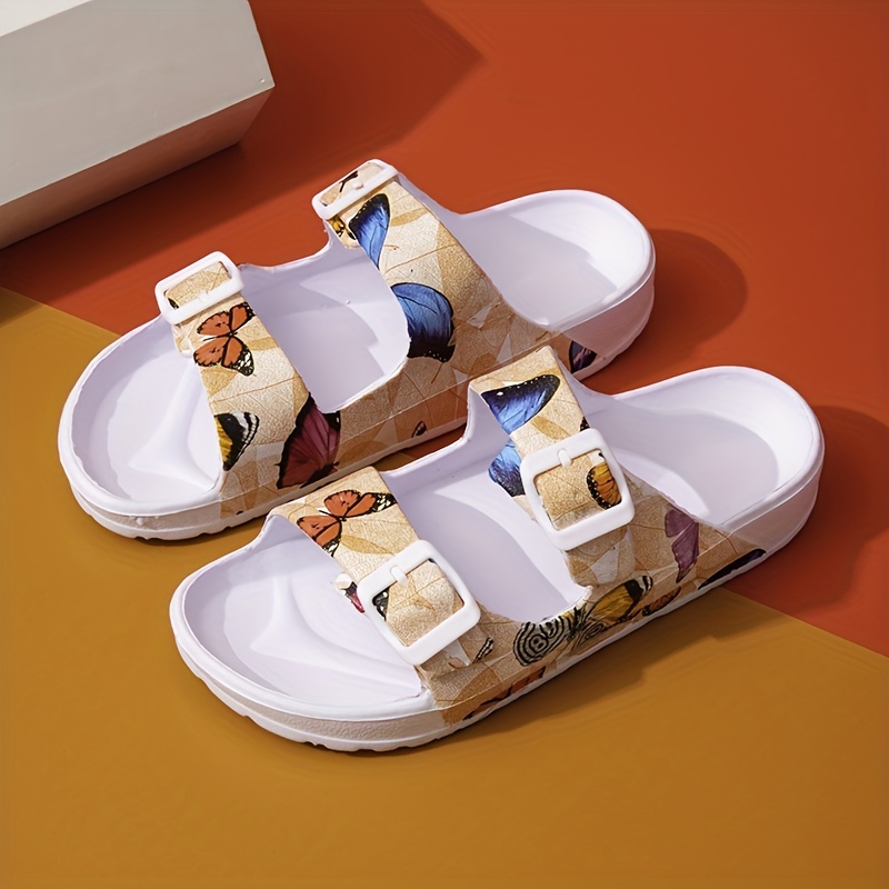 Women’s Butterfly Print Slide Sandals – Double Buckle Strap Open Toe Non Slip Shoes for Indoor & Outdoor Beach Wear