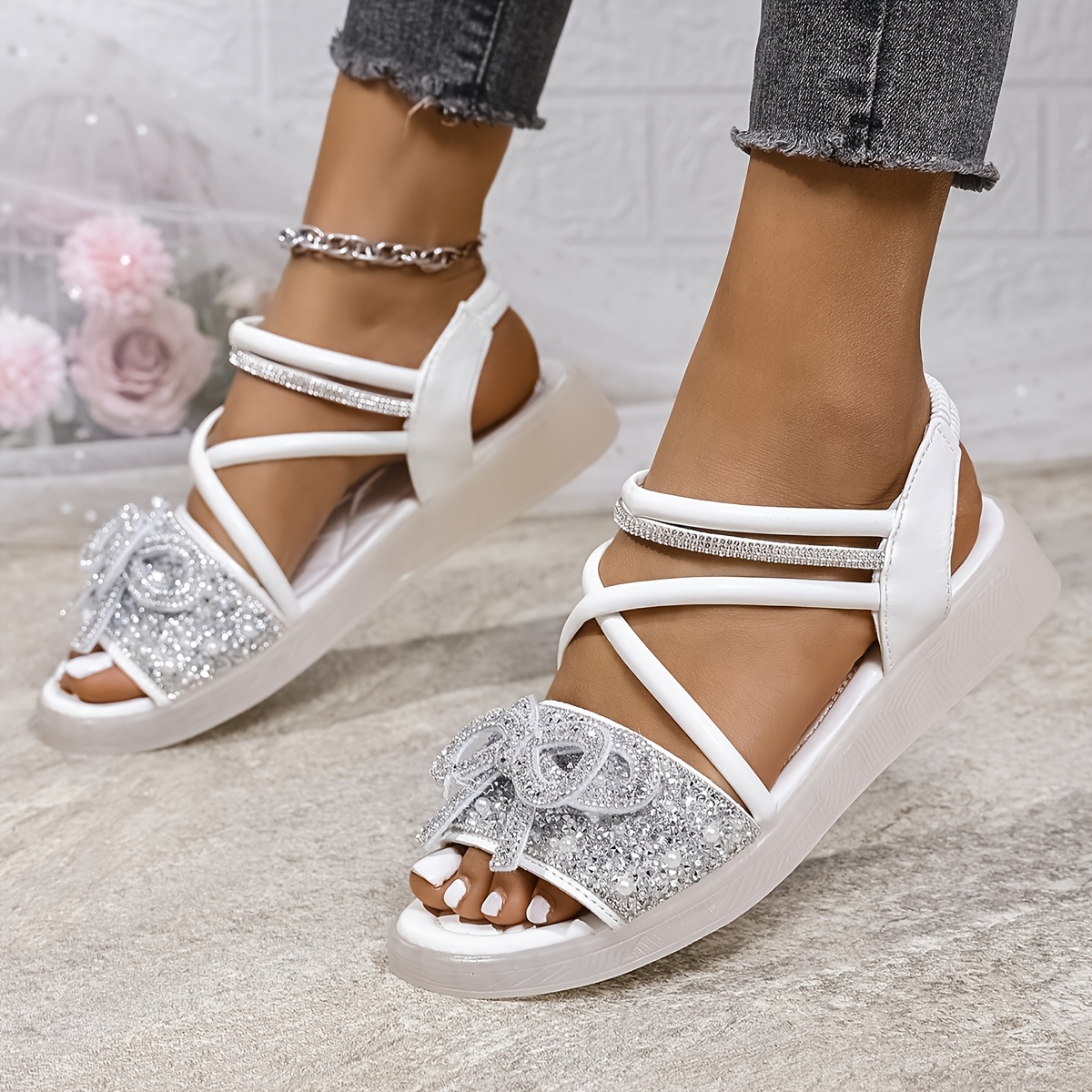 Women’S Sparkling Rhinestone-Embellished Slip-On Flat Sandals – Open-Toe Synthetic Cover with Cushioned Rubber Sole for Casual & Formal Occasions, Ladies Shoes And Sandals, Evening Wear, Glamorous Accessory, Durable Construction, Stylish Footwear, Fashion Lovers